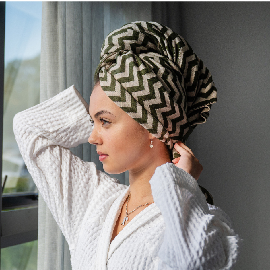 Ecovask's Organic Cotton Hair & Travel Towel – the ultimate essential for drying your hair! Say goodbye to bulky bath towels and staticky microfiber turbans.
