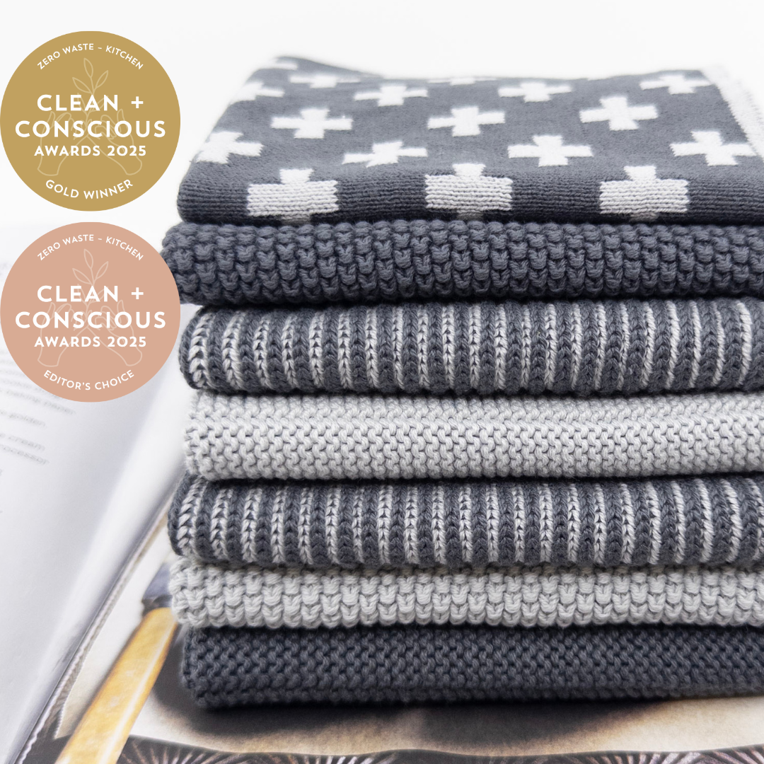 Our Ashlynn Daily Use Dishcloth Pack brings together seven beautifully crafted organic cotton cloths from our Graphite and Lunar colourways - a calm, contemporary palette that pairs effortlessly with modern kitchens.